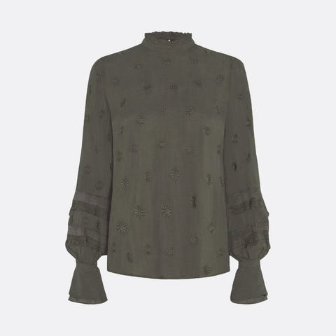 Chantelle Ferrant bluse/ skjorte I str L. Farge mørk beige. Det er glidelås i siden og på armene. Det er en smal modell.