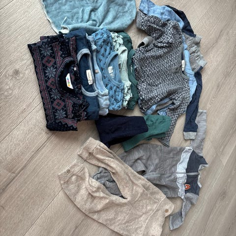 Selger en liten ullpakke i størrelse 60-62. Pent brukt ull, og ett par bodyer i ull/silke blanding. Janus buksen er kjøpt brukt, og noe slitt, så følger med gratis.