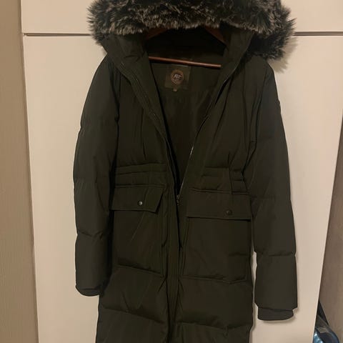 Brukt 3 ganger, mye yttertøy. Veldig varm velour som fôr. Fin kaki farge. Vinterjakke av høy kvalitet.