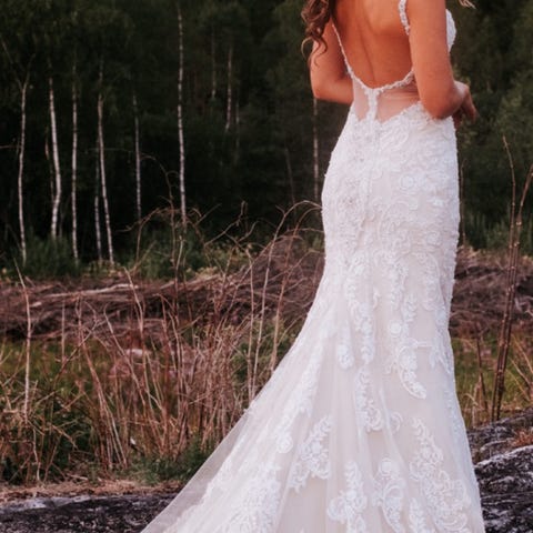 Nå er kjolen ferdig renset og klar for ny brud. Kjolen er i en S/M (S i midje og M rundt hofte). Slør (3M) og spenne til å løfte slepet (se bilde) følger med om ønskelig.