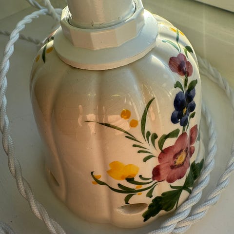 Koselige gamle lampetter til minjongpærer. Uten stikkkontakter. 1 av de har et avslag (bruk litt hvit neglelakk hvis du vil) og et minihakk synes ikke hvis du henger den på siden eller bak. Den andre er helt fin. Ca cm mål : 14,5 x 10. Trenger en vask etter lang tids lagring. Selges samlet 300.-
