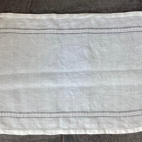 Str 97 cm x 50 cm. I fine farger. Usikker på kvalitet, men kjennes som lin, men kan og være blanding. Krøller seg når bretter sammen som oftest naturstoff gjør. Står ikke merking på løperen. Stoffet er vevd som i damaskveving. Kan brukes på begge sider. Eventuelt for gjenbruk/ redesign. Ser ingen slitasje eller flekker. Fin på bordet..