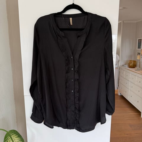 En fin bluse i to «lag». Gjennomsiktig stoff ytterst, og bomullsstoff i innertopp. Armene er ikke foret. Fine detaljer