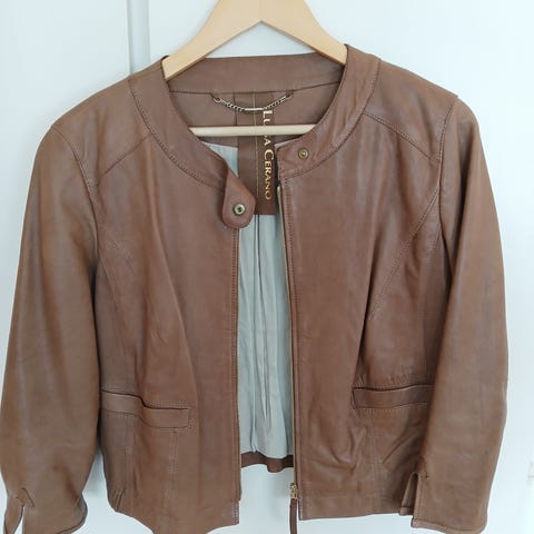 Det står xxl, mrn jeg er str 40 og den passer meg. Lekker semsket skinnjakke