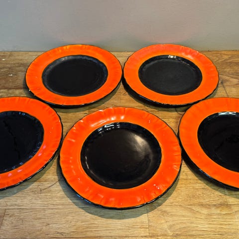 Elegant og romslig tallerken fra Figgjo Flint, produsert i Norge rundt 1960–70. Tallerkenen har en vakker lyseblå kant med preget mønster og lett bølget form. Perfekt som kakefat, serveringsfat eller dekor i et retroinspirert hjem.
