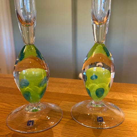 To nydelige små lysestaker i blått glass og messing, høy kvalitet!