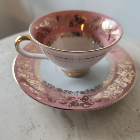 Gammel pyntekopp/samlekopp med skål i rosa, grønt og gull. Lusterdekor.