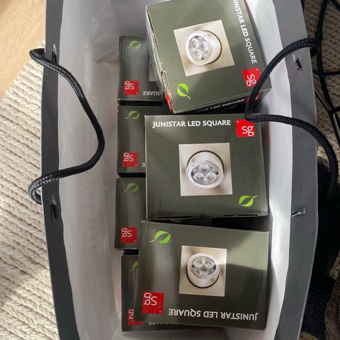 Selger Aura light 7W LED taklyspærer. Per stk 50kr, for alle 10 300kr. Disse er energivennelige og sparer bedre strøm enn tradisjonelle taklyspærer.