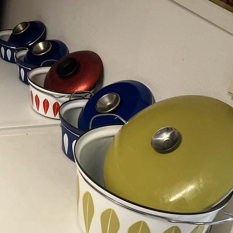 To kasseroller fra Cathrineholm i brun. Godt vedlikeholdt
