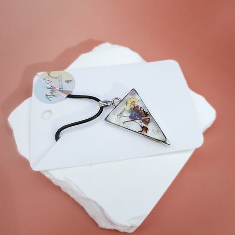 Fargerikt håndlaget kjede med rektangulært resin anheng. Anhenget har blå/turkis glitter, tørkede blader.