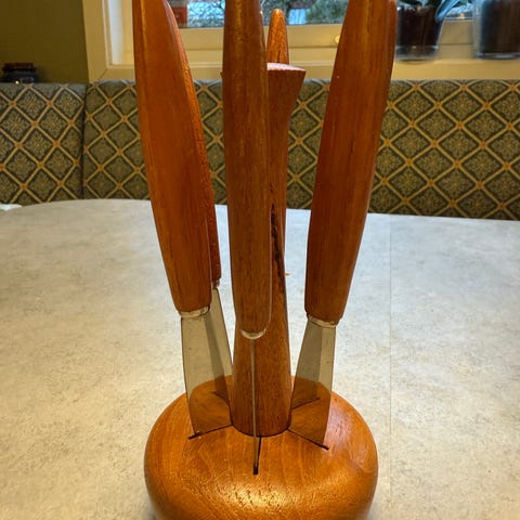 Veldig fint. Stort salatbestikk sett med teak skaft og rustfritt stål. Helt og pent. Ligger i orginalesken, esken er limt i hjørnene.