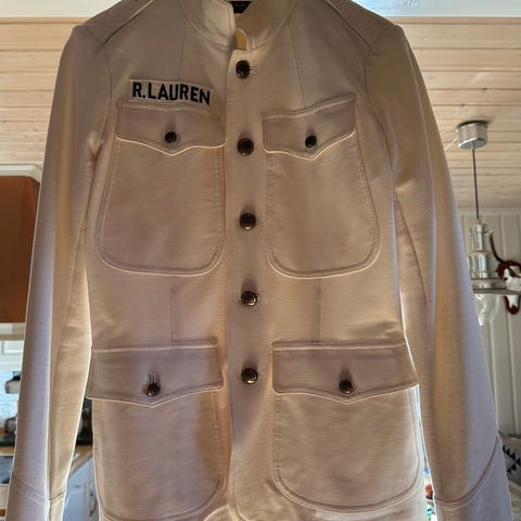 Kremhvit / off-white. Nesten ikke brukt. Lang modell ca 70 cm fra skulder. 100% merinoull. Brodert emblem i sølv.