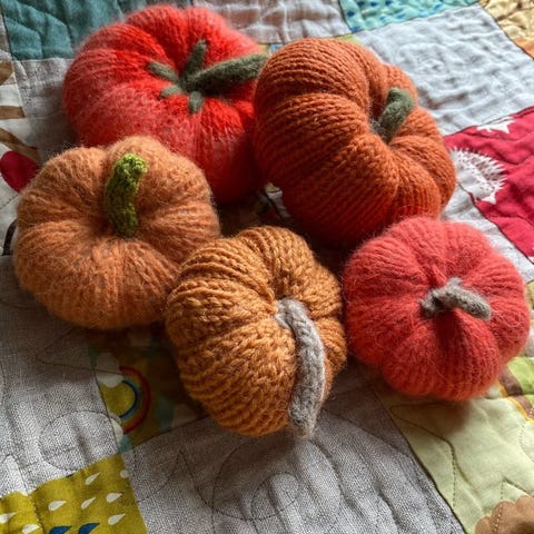 Strikka gresskar i forskjellige farger og størrelser.Fin høstpynt.