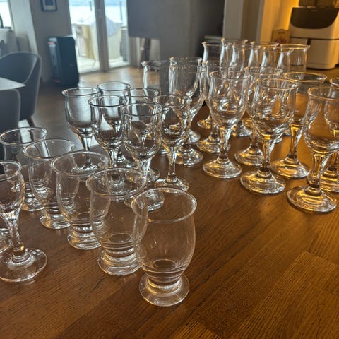 En samling akevittglass, 6 Løiten og 4 Linie. Høyde ca 14cm. Ett av Linie-glassene er litt større enn de andre. Alle er hele og gnistrende blanke og pene. Perfekt til fårikålkalaset og pinnekjøttet.