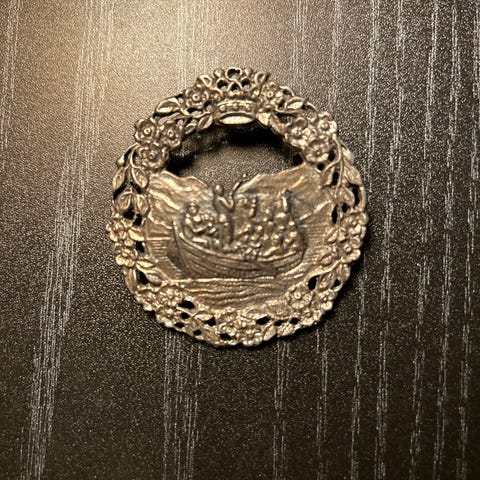 Selger brosje i tinn, stor ringspenne modell «Ætt», brukt til bunadscape.