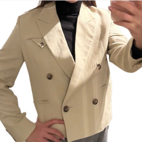 Allen Blazer fra DAY. En overdimensjonert, fôret blazer med én knapp i front i en deilig lin/bomullsmiks. Blazeren har lommer foran og på brystet, samt skulderputer. Str 38.