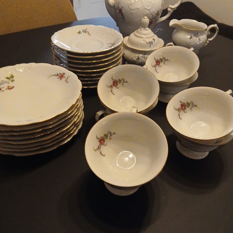 Håndmalt porselens servise m/ willrose og bjørnebær. Til12 pers. Selges hels samlet, men kan deles til 6 pers . Kr400,-
