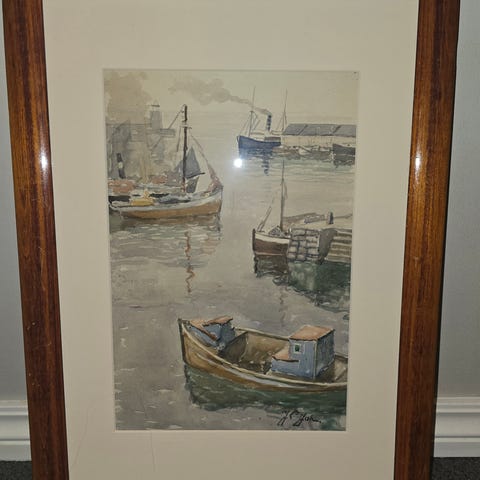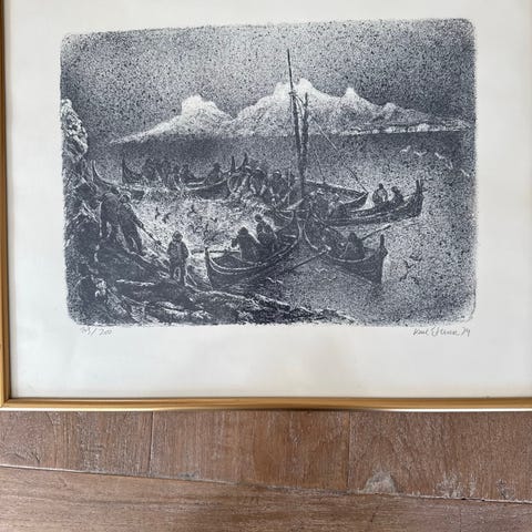 Grafikk. Trykk med motivet fiskebåter. Vanskelig å tyde kunstnerens navn (se bilde). Bildet er 64cm (bredde)• 56 cm (høyde).