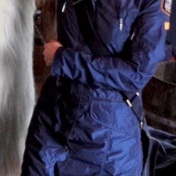 Anvennelig jakke med snøring i livet, glidelås i siden, slipp bak og godt med lommer. Hetten kan rulles inn.