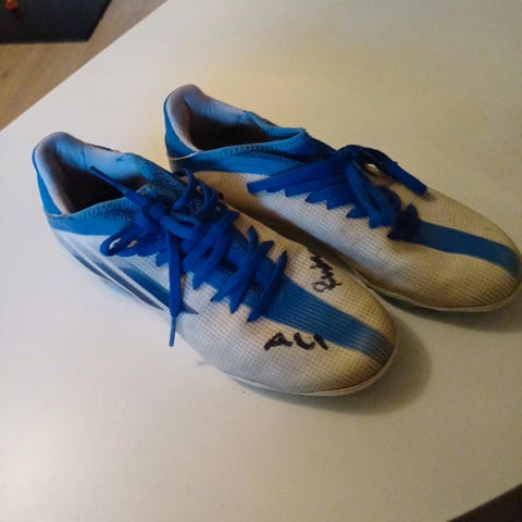 Adidas fotballsko for grus, str 38. Disse har litt mykere såle, og har her blitt brukt som reservesko på gress. I utgangspunktet lisser, men disse har aldri blitt brukt her.