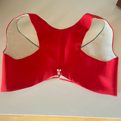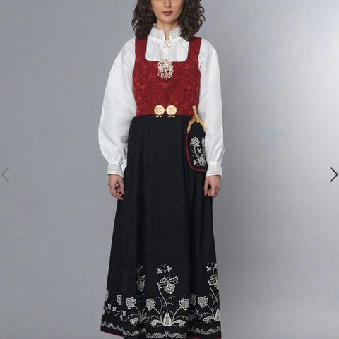 Overdel til Follobunad i vinrødt brokadestoff selges. Sjøgrønn kant. Str. ca. 44. Pent og lite brukt. Velholdt.