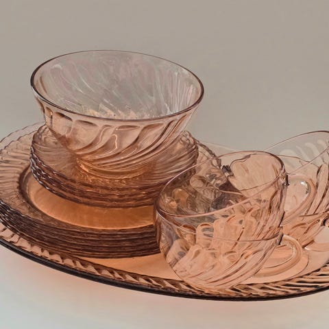 Fem deler fransk vintage opalin med blå blomster, selges samlet for 350kr.
