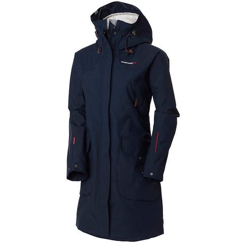 Women's Thelma Parka fra Didriksons er en helt vann- og vindtett parkas med teipede sømmer. Den har en feminin stil som fremheves av snøringen i midjen og falden.