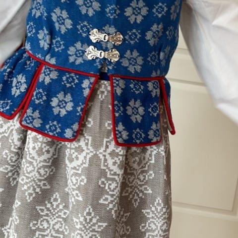 Stoffet til bunaden er kjøpt hos Husfliden. Vesten har mønster bølge m rose og forkle har mønster vekre.
