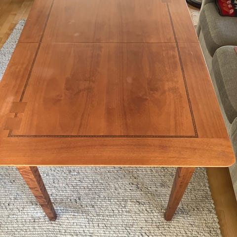 Selger et spisebord i heltre, med mørk beis. Litt patina, men i god stand