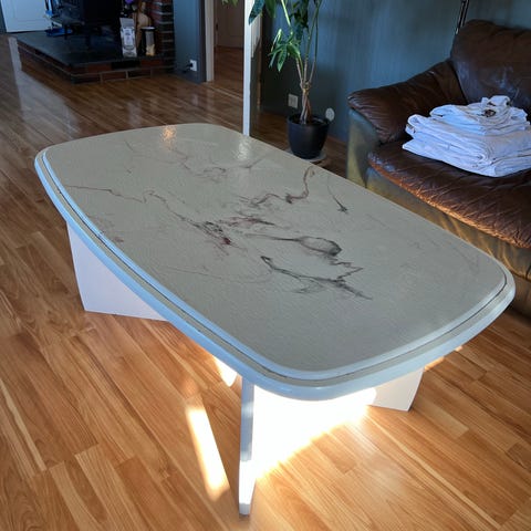 Tungt robust bord. Bordplaten kan løftes av da denne ikke er festet men ligger stødig på. Like helt, men har noen riper. Selges 300
