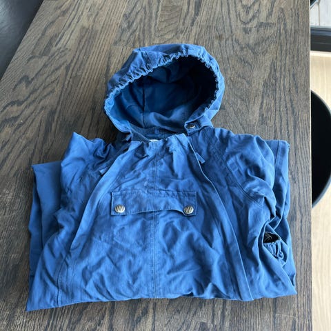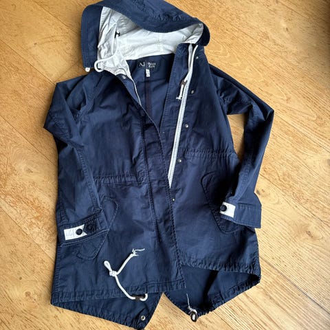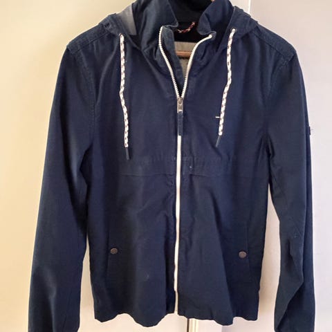 Selger en lite brukt jakke. Brukt av gutt som skolejakke. Vindtett. Vannavstøtende. Fast hette med snøring. To gode lommer i front. Noe bruksmerke høyre lomme. Se bilde.