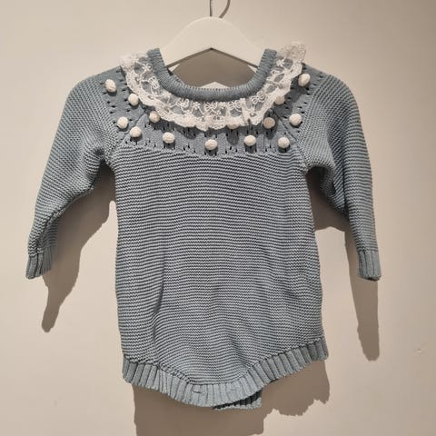 Pent brukt skjorte og shorts i ett med trykkknapper ved lårene for enkelt skift. Passet fra 80 til 86 her. Behagelig å bevege seg i og veldig søt, nydelige farger