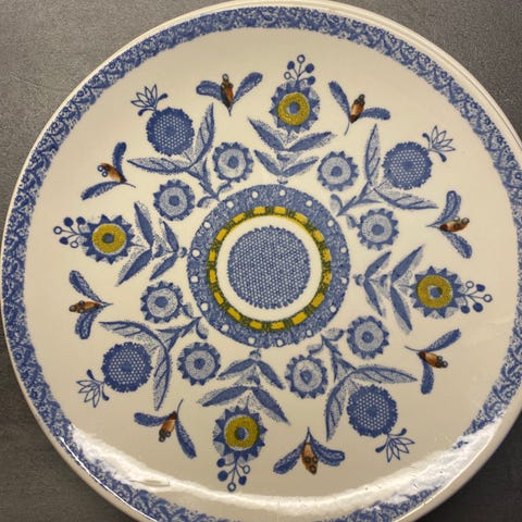 Designet av Inger Waage og produsert av Stavanger Flint . Den har en Diameter på 15,6 cm og den har en høyde på 2,5 cm . Den er normalt brukt og har normal bruksslitasje utifra alder . Den har ingen skår , nag eller krakelering . Den selges som vist på bildene og den kan hentes hjemme hos meg sentralt i Oslo eller så kan den sendes . 💐