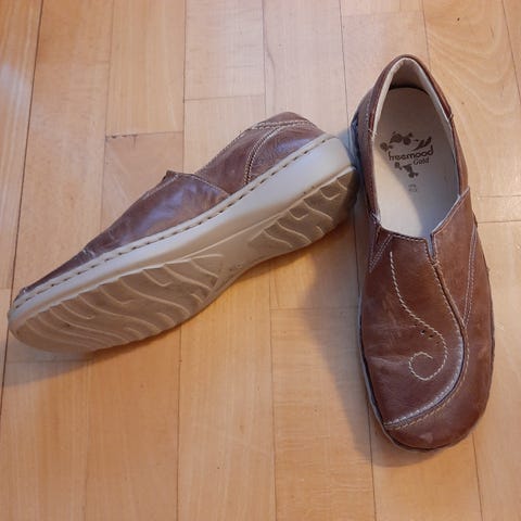 Rødt lær overlær, meget behagelige sko med liten platå og moderat hælhøyde. Sitter utrolig godt på foten.