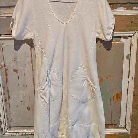 Knapper foran i øvre del, kan snøres inn i livet og har lommer. Samme modell i to ulike farger.