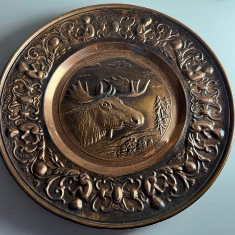 Flott vintage Tallerken med fuglemotiv av messing og emalje
