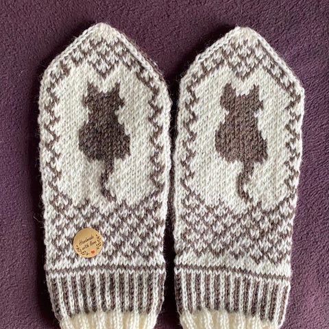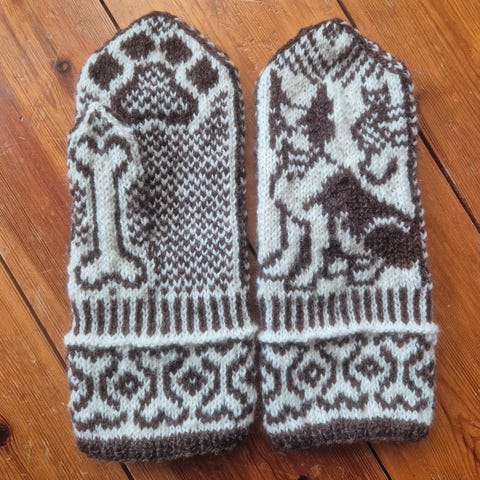 Jeg strikker votter og pannebånd med schnauzer-motiv på bestilling
