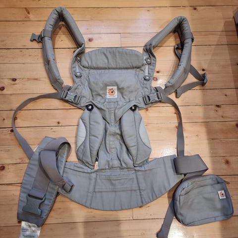 Den er brukt bare lit men jeg er veldig fornøyd har nok plas for Ekstra klær, bleie, flaske etc. sitterfast når man henger i vogn også😊