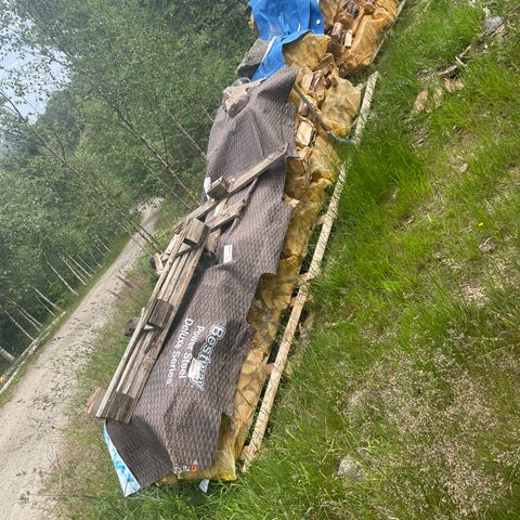 Tørr ved, lagret ute under bølgeblikkplater.