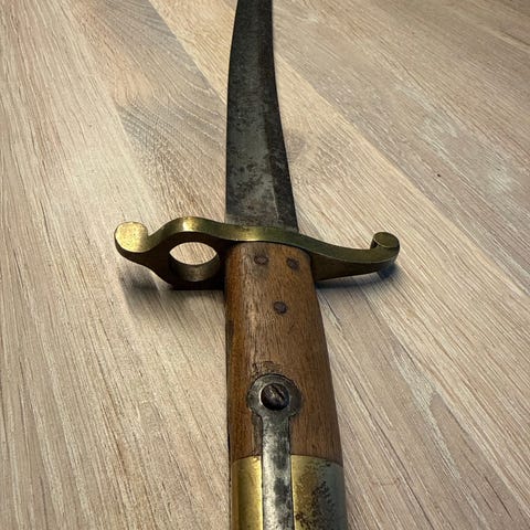 M/1916 Krag Jørgensen lang knivbajonett. Bajonetten er produsert på Kongsberg våpenfabrikk. Uten balg. Flott bajonett