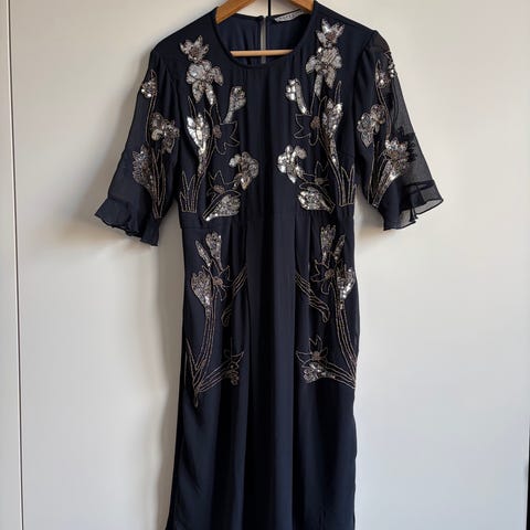 Lekker DKNY silkekjole mørkblå med paljetter str. S selges. Kjolen er kun brukt ved noen få anledninger og fremstår omtrent som ny.