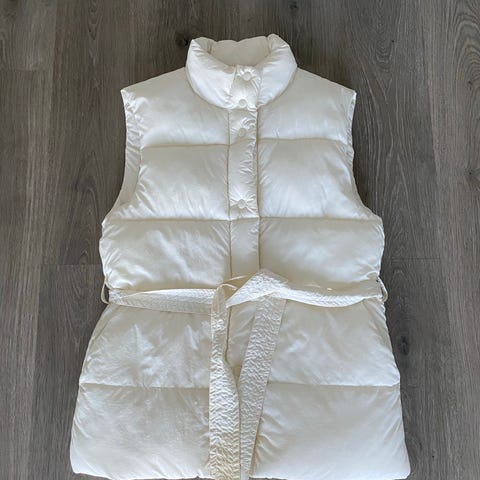 En puffet vest med høy hals, sidelommer og belte rundt livet.