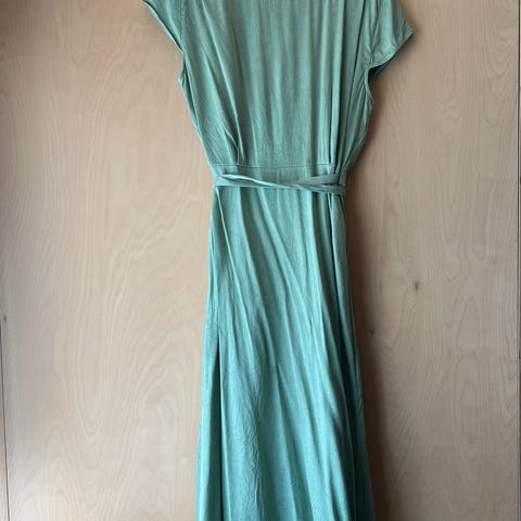 Lang omslagskjole, merke Andrea, str L (42). Ikke synlig brukt. Nydelig å ha på, tynt chiffonstoff men ikke gjennomsiktig så du slipper å styre med underskjørt.