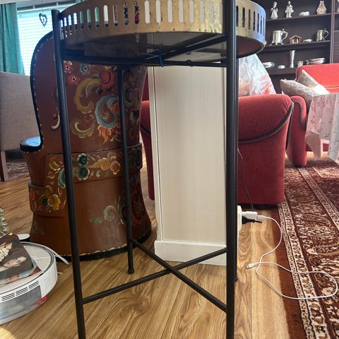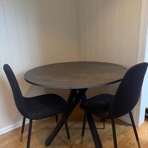 Grått rundt settebord med hjul. 45 cm i diameter og 48 cm høyt