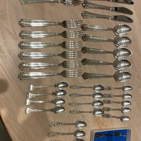 3 skjeer i forskjellige størrelser, 1 gaffel i plett fra England