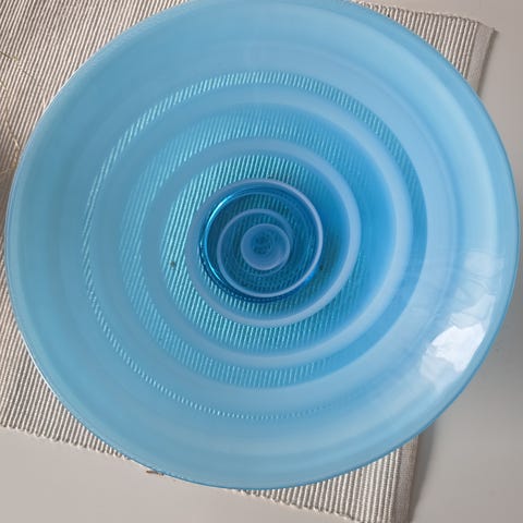 Fatet har diameter ca 35,5 cm, høyde ca 5,5 cm og veier ca 1400 g. Kan brukes som pynt, som fruktfat, til snacs, som kakefat, eller noe helt annet. Vakkert å se på.