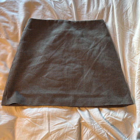 Pent skjørt, rutete i brunt, beige, hvitt og svart. Str medium, polyester og viscose fra Honey Punch, pent brukt. En stoffknute på baksiden, liten betydning.