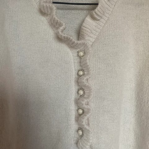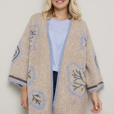 Grå cardigan med gule og hvite nyanser. Koselig å ha på seg, elegant i tillegg.