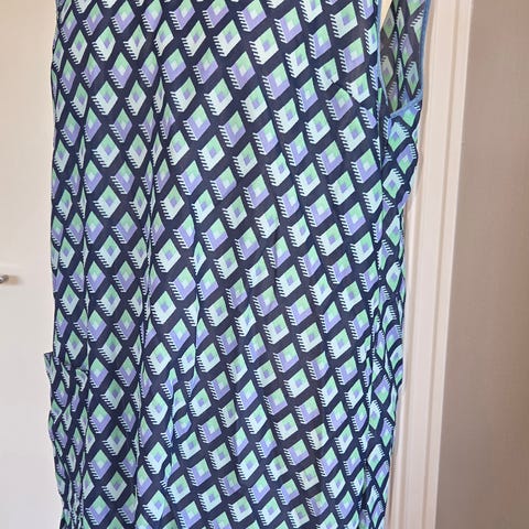 Stilig kjole fra Gudrun Sjøden. Ikke foret. Lommer. Bomull. Pent brukt. Rett modell. Lengde fra overkant skulder til skjørtekant ca 90 cm. Omkrets under armer ca 110 cm, liv ca 110 cm. Se også mine øvrige annonser.