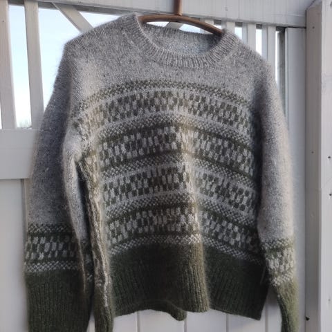 Genser størrelse XXL, strikket i Gjestal Safirgarn. Overvidde 120, lengde 66.